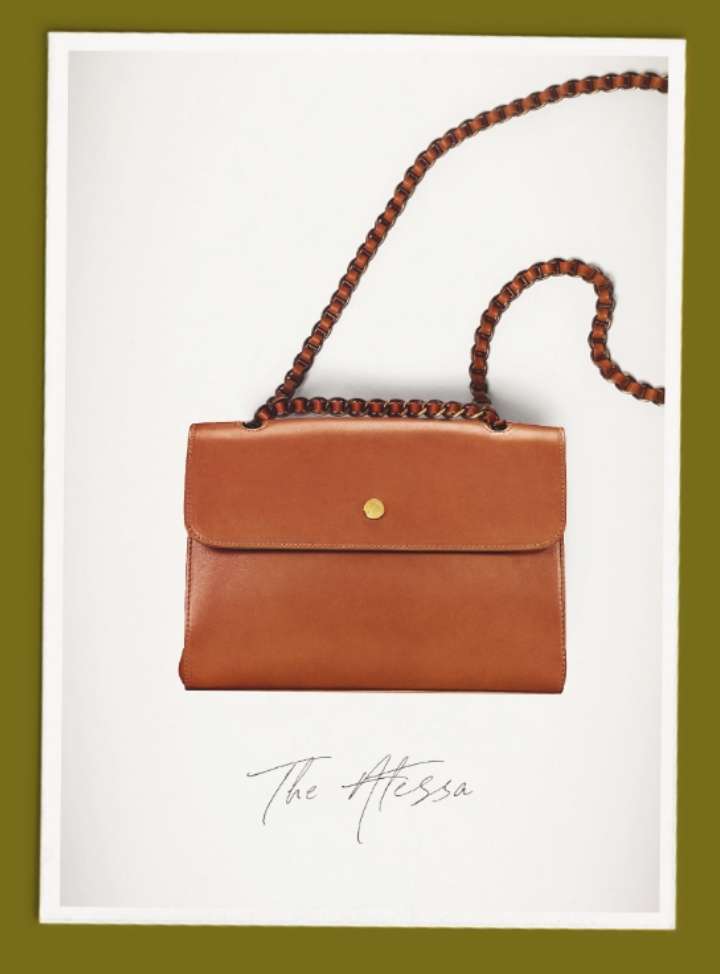 A handbag collection is never complete without a classic chain strap style. The Atessa is our take on this timeless handbag design, styled in an effortless envelope shape for a pared-back look. The iconic brass chain strap adds a contemporary touch to any outfit, making this a versatile and trendy handbag choice designed to complement any look.