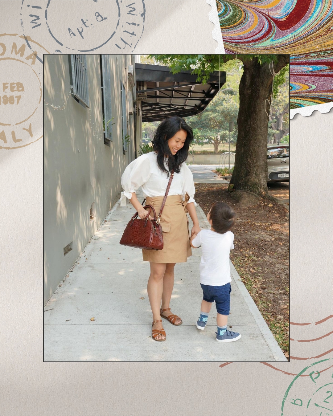 Over to sunny Sydney, Australia next – Virginia accessorises her chic summer fit here with the classic Liliana S bowling bag. Thoughtfully crafted with luxury leather and lined with durable cotton, this sophisticated ladies bag offers a careful combination of style and function. Virginia wears hers with the detachable leather shoulder strap for a versatile look, a great choice for exploring the vibrant city streets of Sydney. ‘My summer holiday staples on high rotation: camel wrap skirt, crossbody mock-croc bag’ she shares.