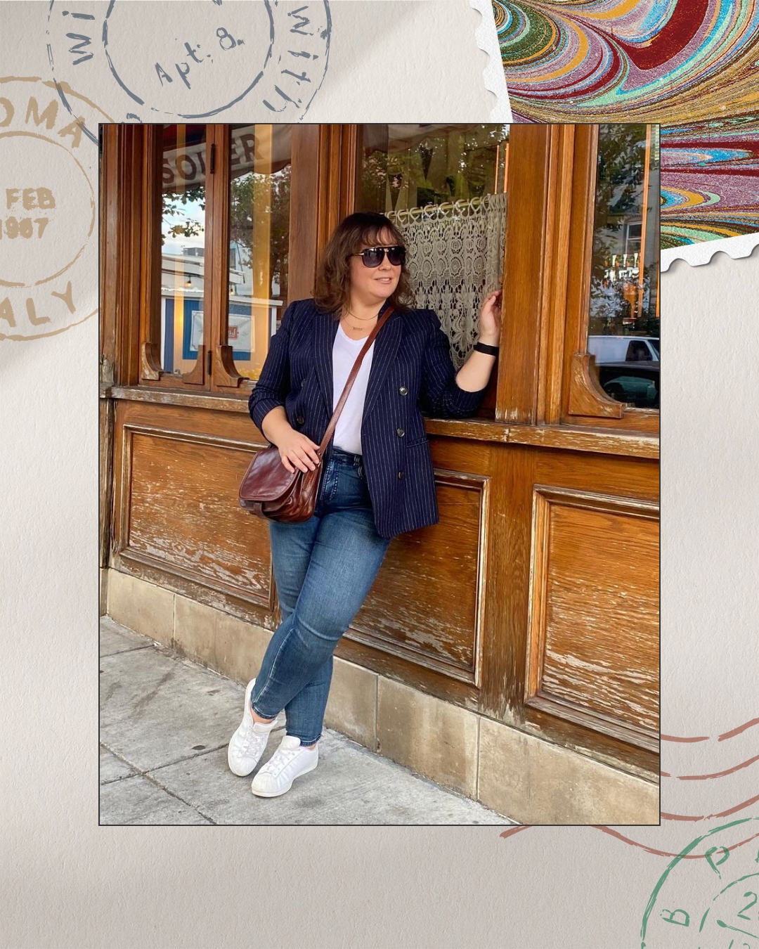 For Alison, summertime is all about catching up with friends over a tasty lunch in the sun. Her casual-chic look is perfectly put together, serving an effortless aesthetic for an alfresco dinner date with the ladies. We can’t help but spot The Medolla M swooped over her shoulder, our classic ladies half-moon bag. Offering a timeless take on the classic saddle bag, this luxury leather accessory features three main compartments and a phone holder – ideal for organising everyday essentials. The luxury Chestnut Tan leather never goes out of style, and we love how it complements Alison’s sleek navy blazer.