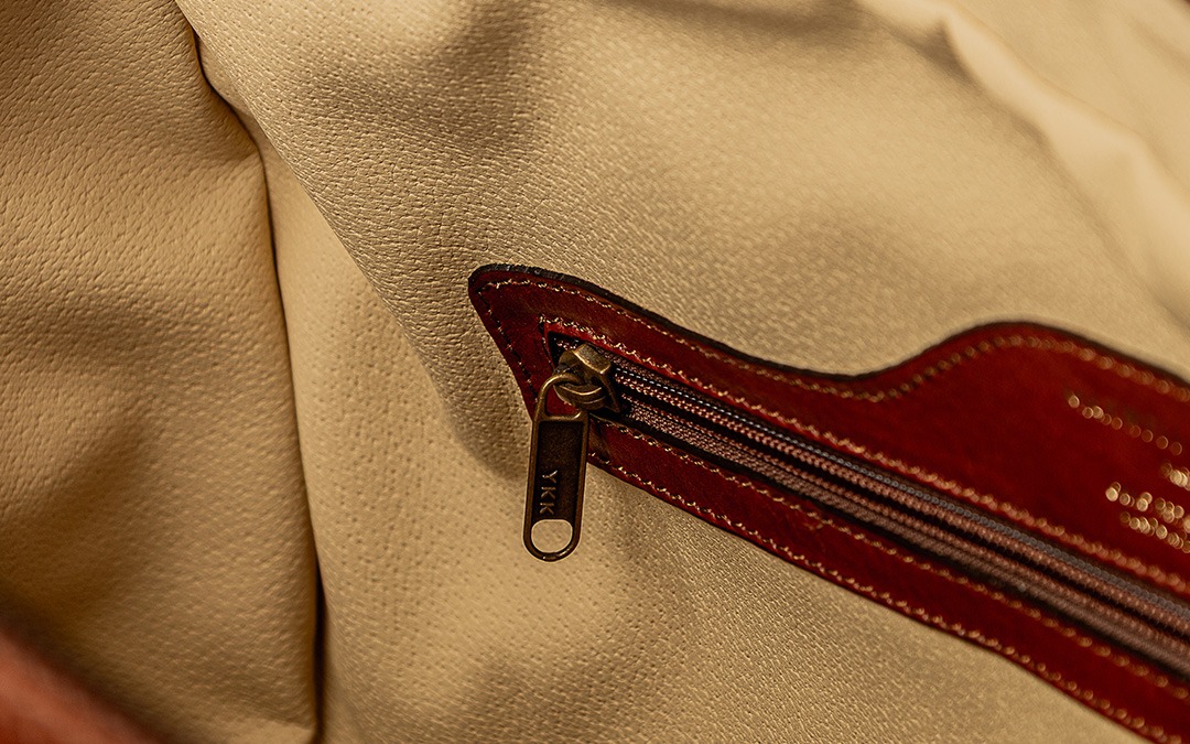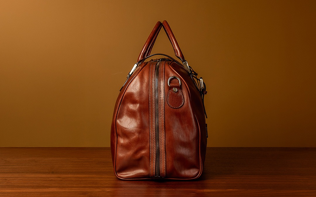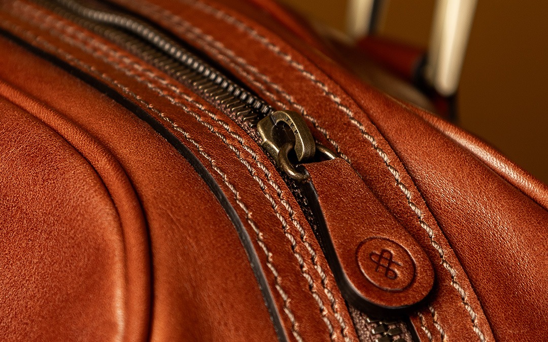 This distinctive luggage bag features a dual floor-to-floor YKK Excella® metal zip, prized for its durability and smooth, self-lubricating glide that improves with use. The wide opening is enhanced by protective gussets, keeping your belongings secure while allowing easy access. Finished with premium metal studs on a reinforced leather base, every detail is designed to protect against moisture and wear, ensuring your bag maintains its quality wherever your journey takes you.